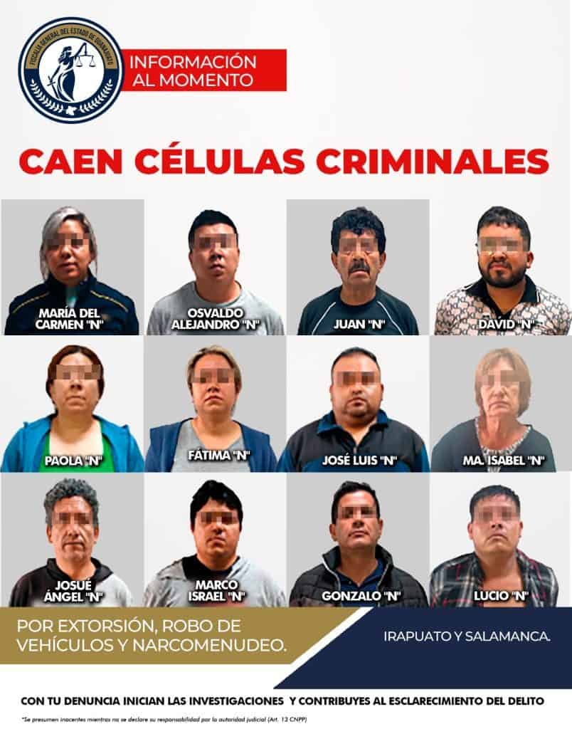 Con la ejecución de operativos para desarticular células delictivas dedicadas al narcomenudeo, la extorsión y el robo de vehículos en Irapuato y Salamanca, fueron asegurados seis inmuebles y la detención de doce individuos vinculados a actividades criminales de alto impacto, entre otros objetos del delito.