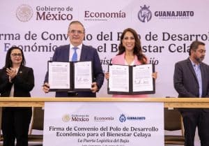 La gobernadora Libia Dennise García Muñoz Ledo, y el Secretario de Economía del Gobierno de México, Marcelo Ebrard Casaubon, firmaron del Convenio de Coordinación para poner en marcha el Polo de Desarrollo Económico para el Bienestar “Puerta Logística del Bajío”.