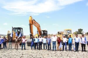Paulo Bañuelos Rosales, secretario de la SDAyR y el presidente municipal Gregorio Mendoza Flores dieron el banderazo de arranque de las obras que permitirán reaprovechar el agua de lluvia en este vaso captador del que dependen 204 hectáreas de maíz, sorgo, garbanzo y avena.