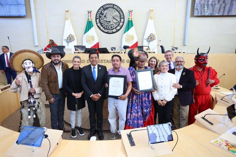 Grupo de personas en evento oficial con personajes tradicionales y reconocimientos en el Congreso Mexicano.
