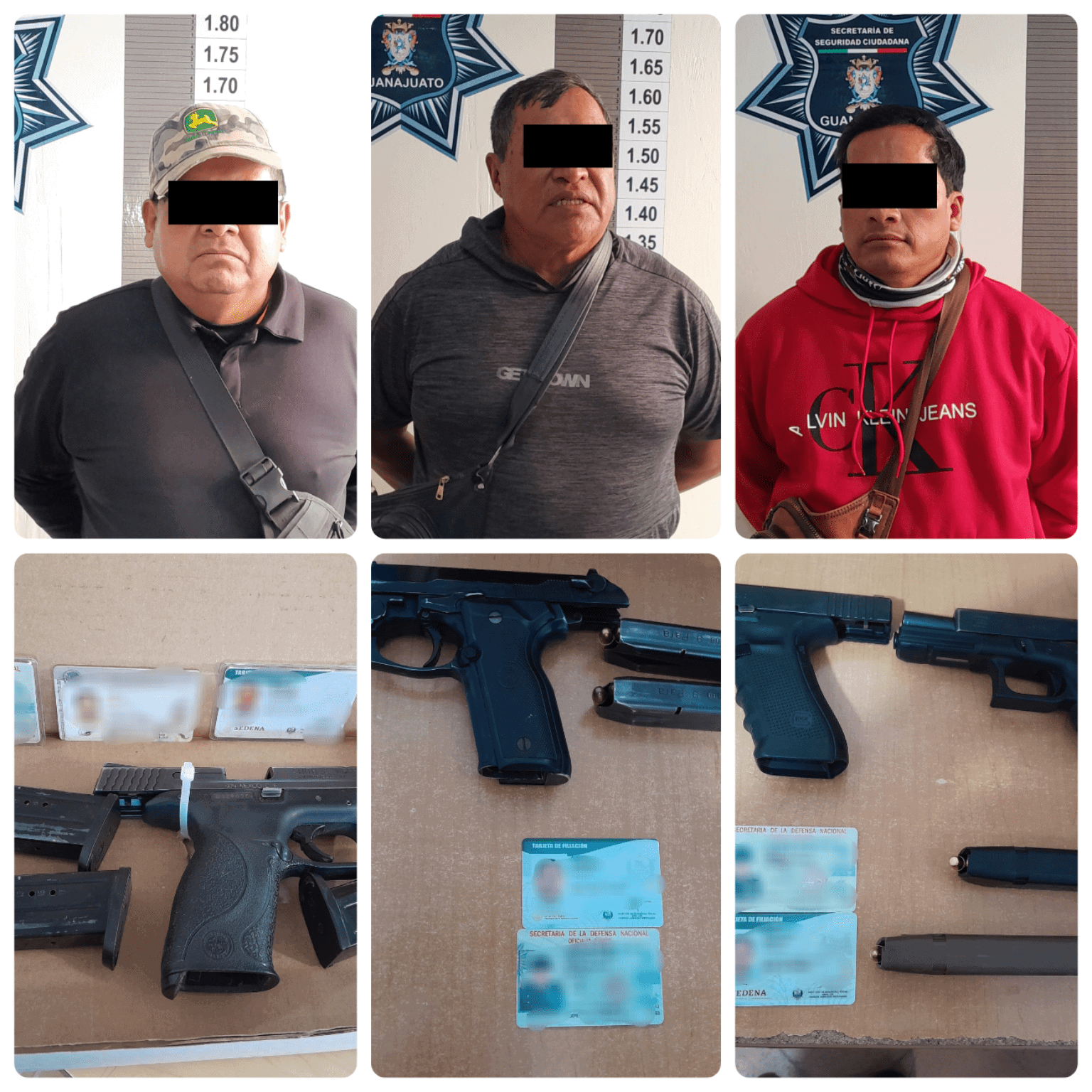 La Policía de Guanajuato capital detuvo a tres hombres por portación de armas de fuego en la colonia Yerbabuena, luego de que fueran reportados por presuntas amenazas a una familia.