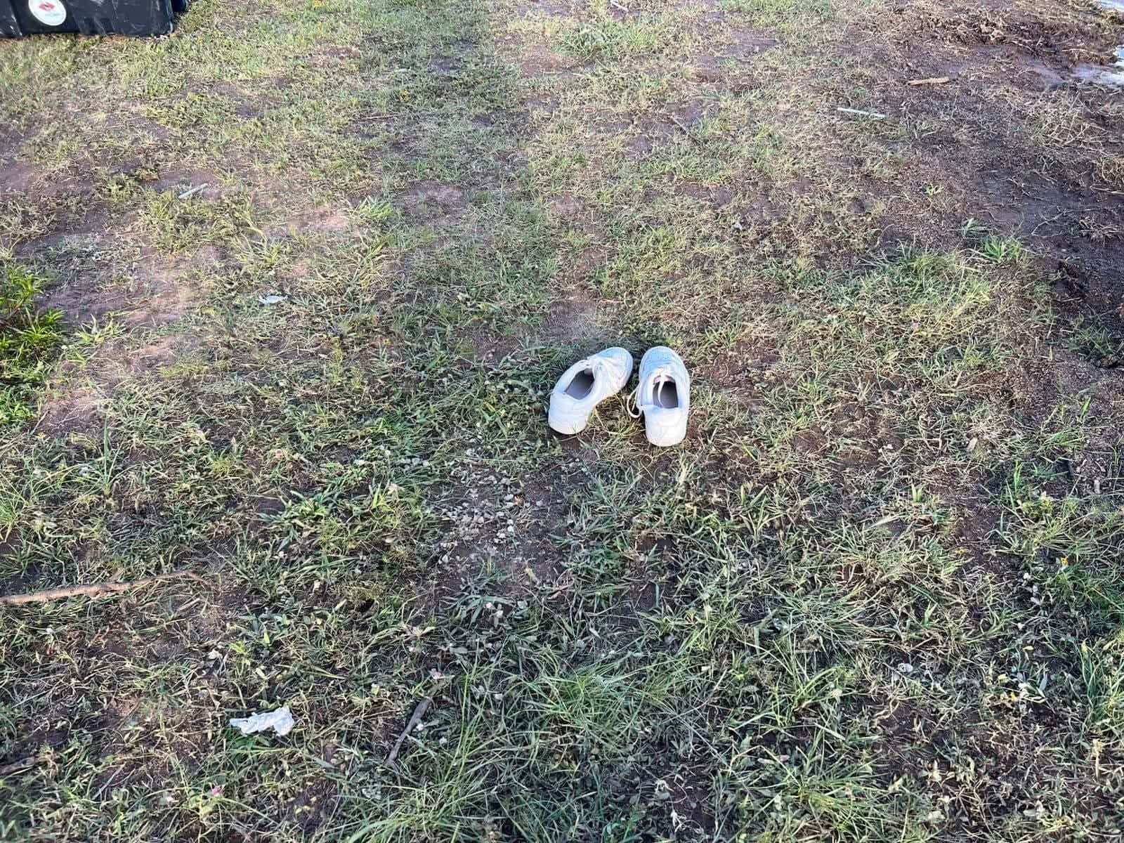 Zapatos blancos olvidados en la calle sobre césped, simbolizando abandono o descanso en espacio exterior.