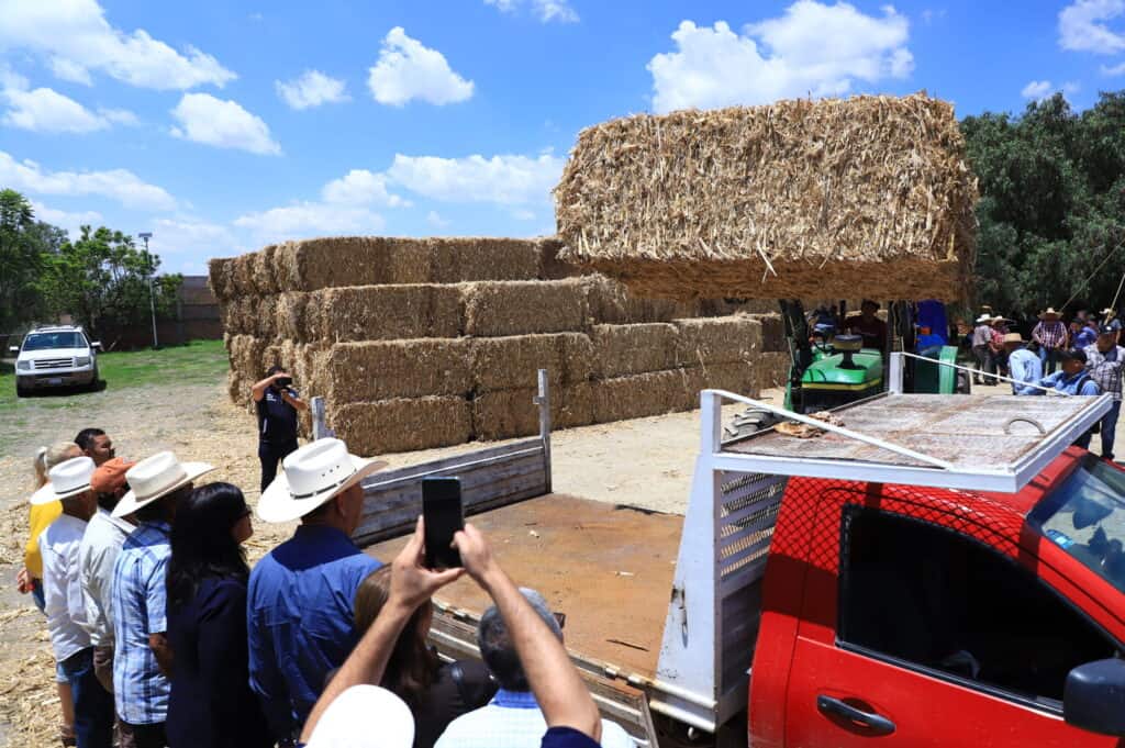 Juventino Rosas, Gto., 13 de julio del 2023.- Para ayudar en la alimentación del ganado de Juventino Rosas, la Secretaría de Desarrollo Agroalimentario y Rural (SDAyR), entregó 300 pacas de rastrojo a los ganaderos de este municipio.