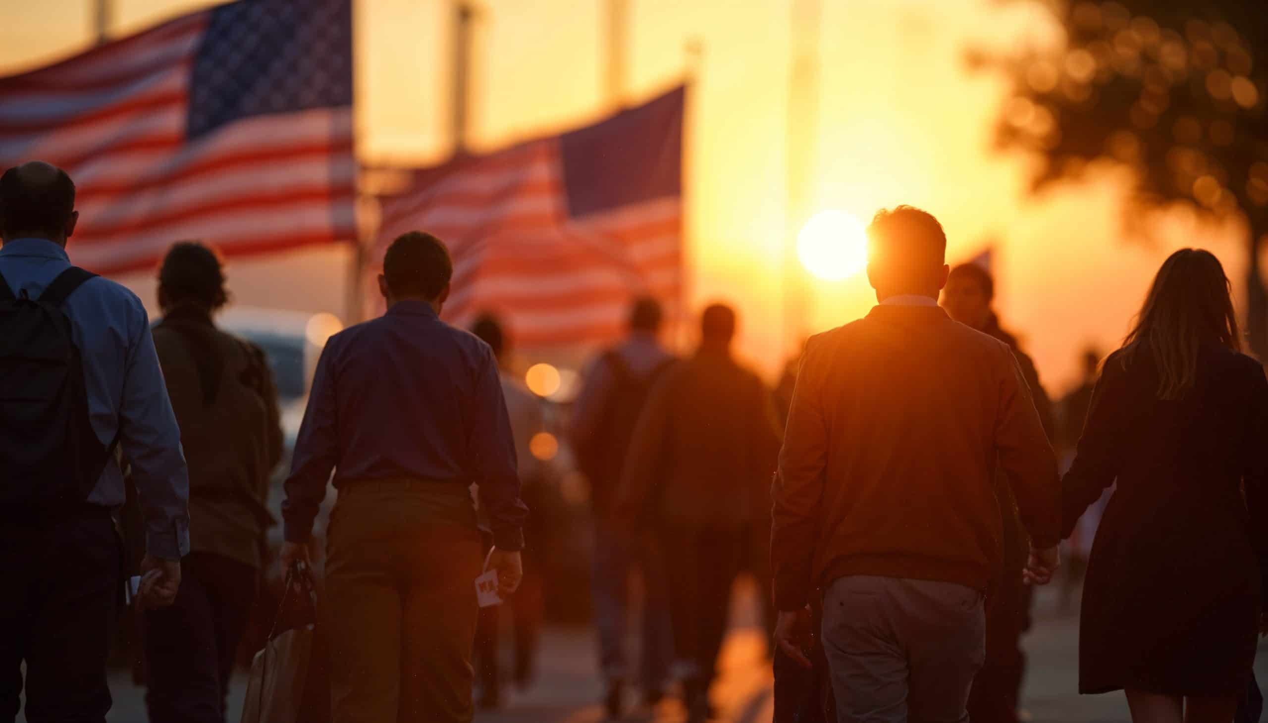 Personas caminando durante evento en la tarde con banderas de EE. UU. y atardecer cálido en fondo, opinión sobre libertad y comunidad.