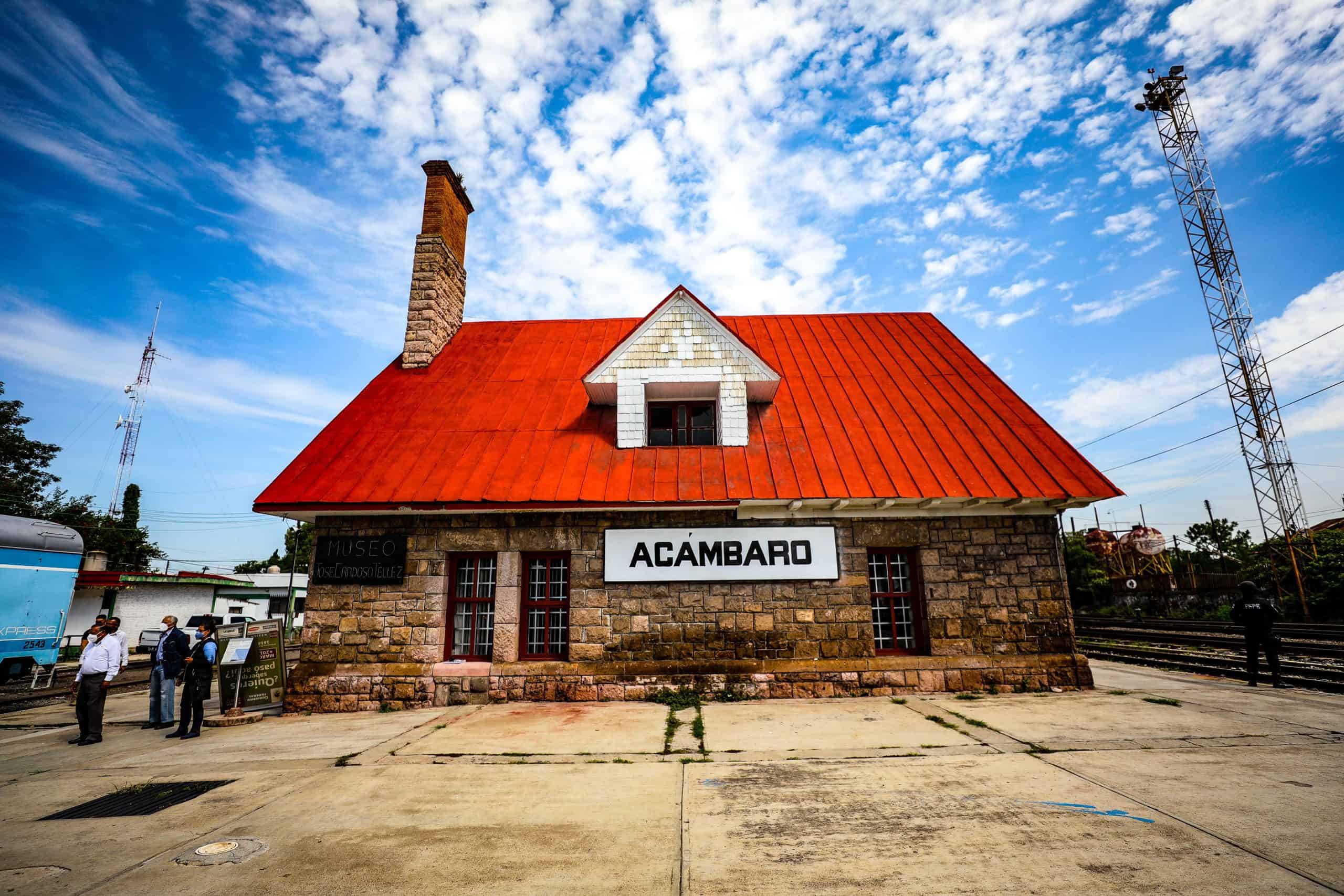 2. Fachada de la estación de tren en Acámbaro, con cartel del museo y cielo azul con nubes.