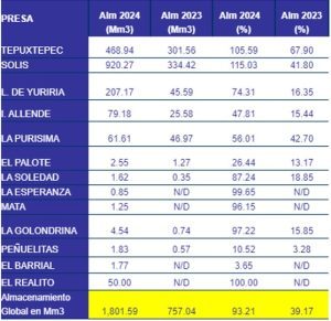 Entre los principales cuerpos de agua que se monitorean en cuanto al nivel de almacenamiento destacan: Presa de Tepuxtepec, Presa Solís, Laguna de Yuriria, Presa Ignacio Allende, la Presa La Purísima, El Palote, La Soledad, La Esperanza, Mata, La Golondrina, Peñuelitas, el Barrial y el Realito.