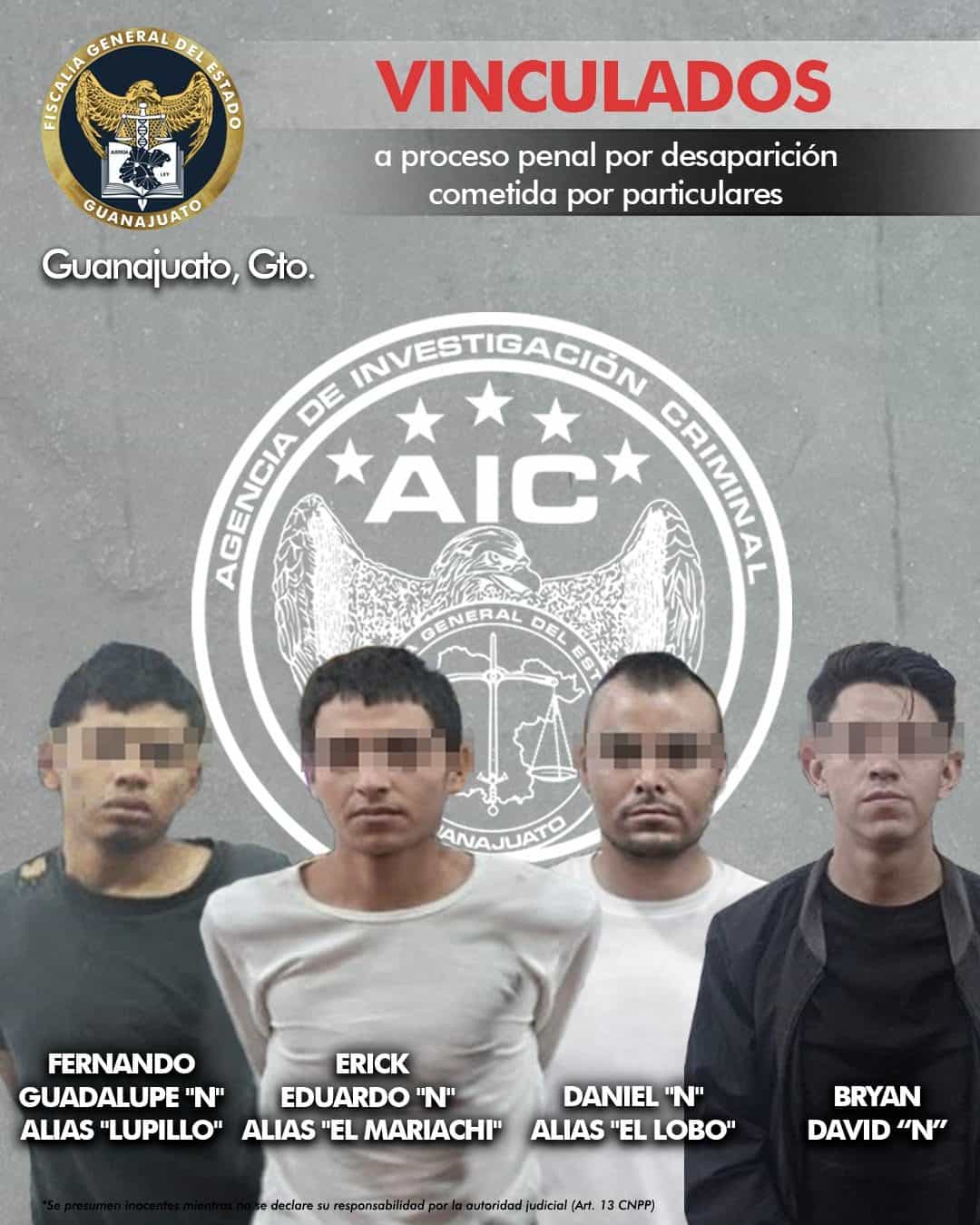 Fernando Guadalupe “N” alias “Lupillo”, Erick Eduardo “N” alias “El Mariachi”, Daniel “N” alias “El Lobo” y Bryan David “N” se encuentran en la cárcel vinculados a proceso penal por el delito de desaparición de personas en la ciudad de Guanajuato.