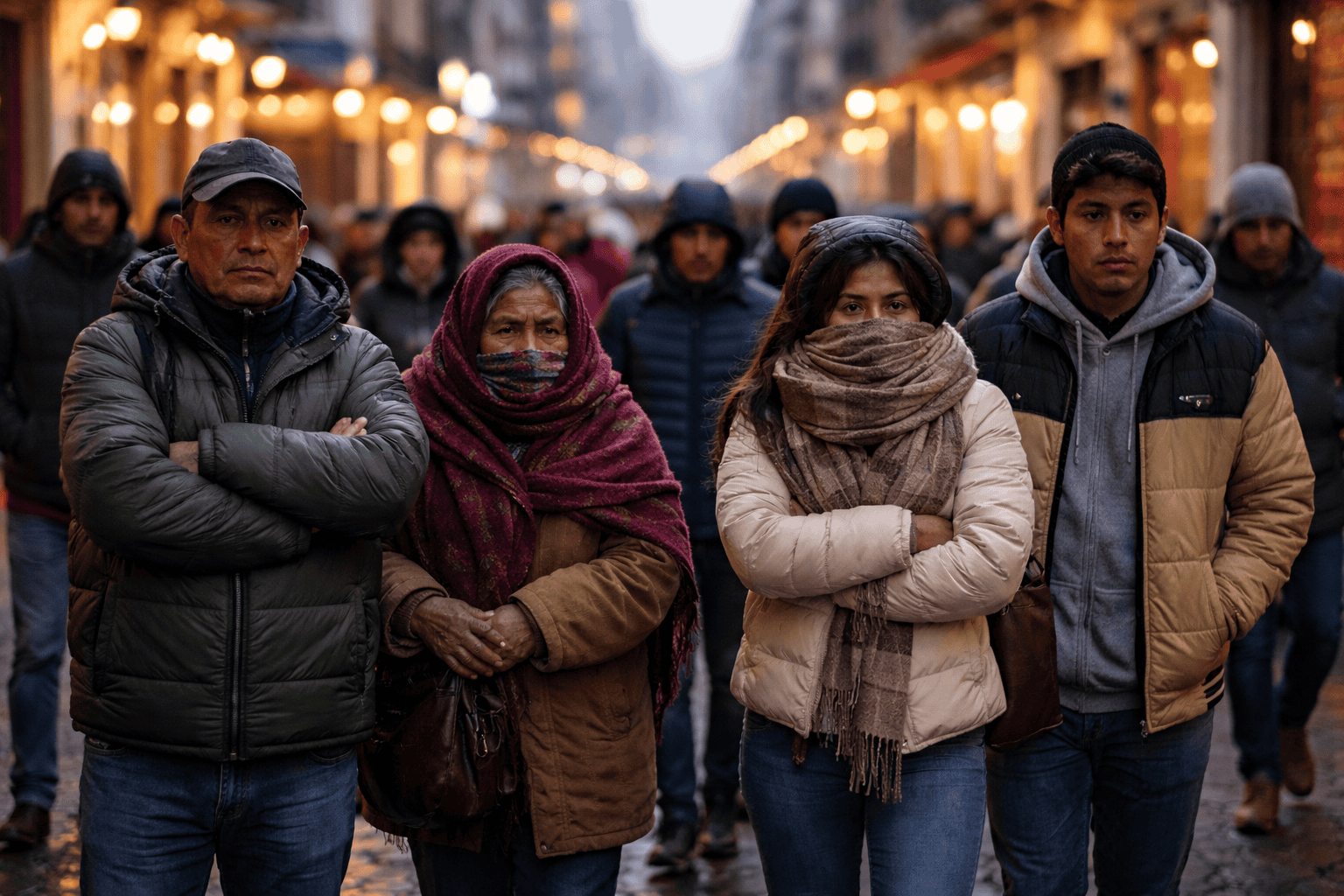Personas con expresión seria en calle concurrida de noche, mostrando resiliencia y comunidad en contexto urbano.