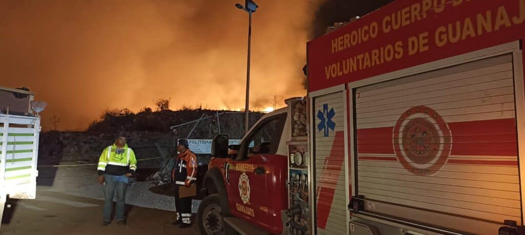 Guanajuato, Gto.; 2 de mayo de 2023.- En coordinación con diversas corporaciones de rescate, la Dirección de Protección Civil Municipal y la Dirección General de Servicios Públicos realizaron labores intensivas para controlar y extinguir el incendio reportado a las 11:30 de la noche de este lunes primero de mayo en el sitio de disposición final, comúnmente conocido como “tiradero municipal”.
