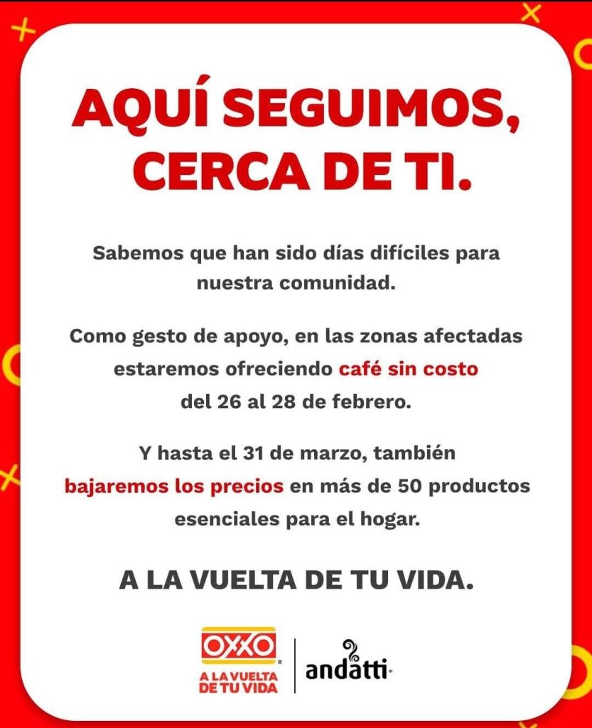 La cadena OXXO anunció que del 26 al 28 de febrero estará ofreciendo café sin costo en tiendas ubicadas en las zonas afectadas, como una muestra de apoyo y cercanía con la comunidad. Además, informó que hasta el 31 de marzo reducirá los precios en más de 50 productos esenciales para el hogar.