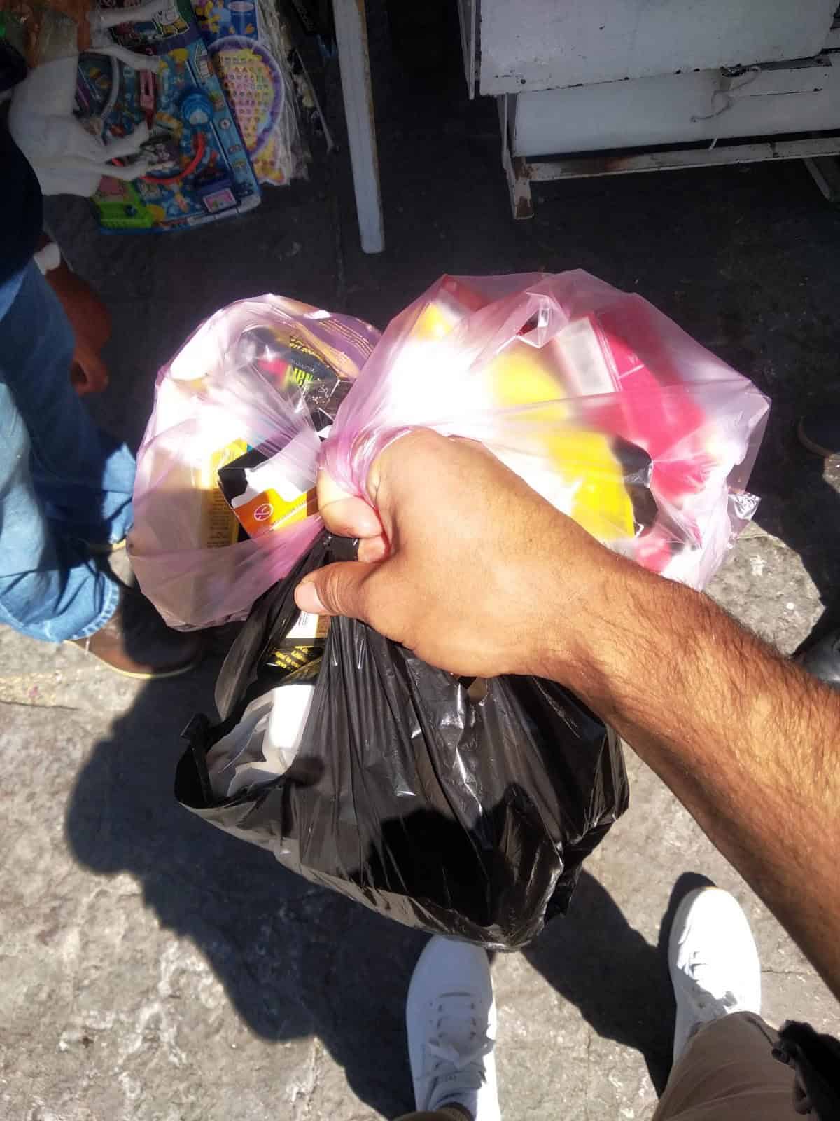 Persona sosteniendo bolsas llenas de artículos en un mercado local.