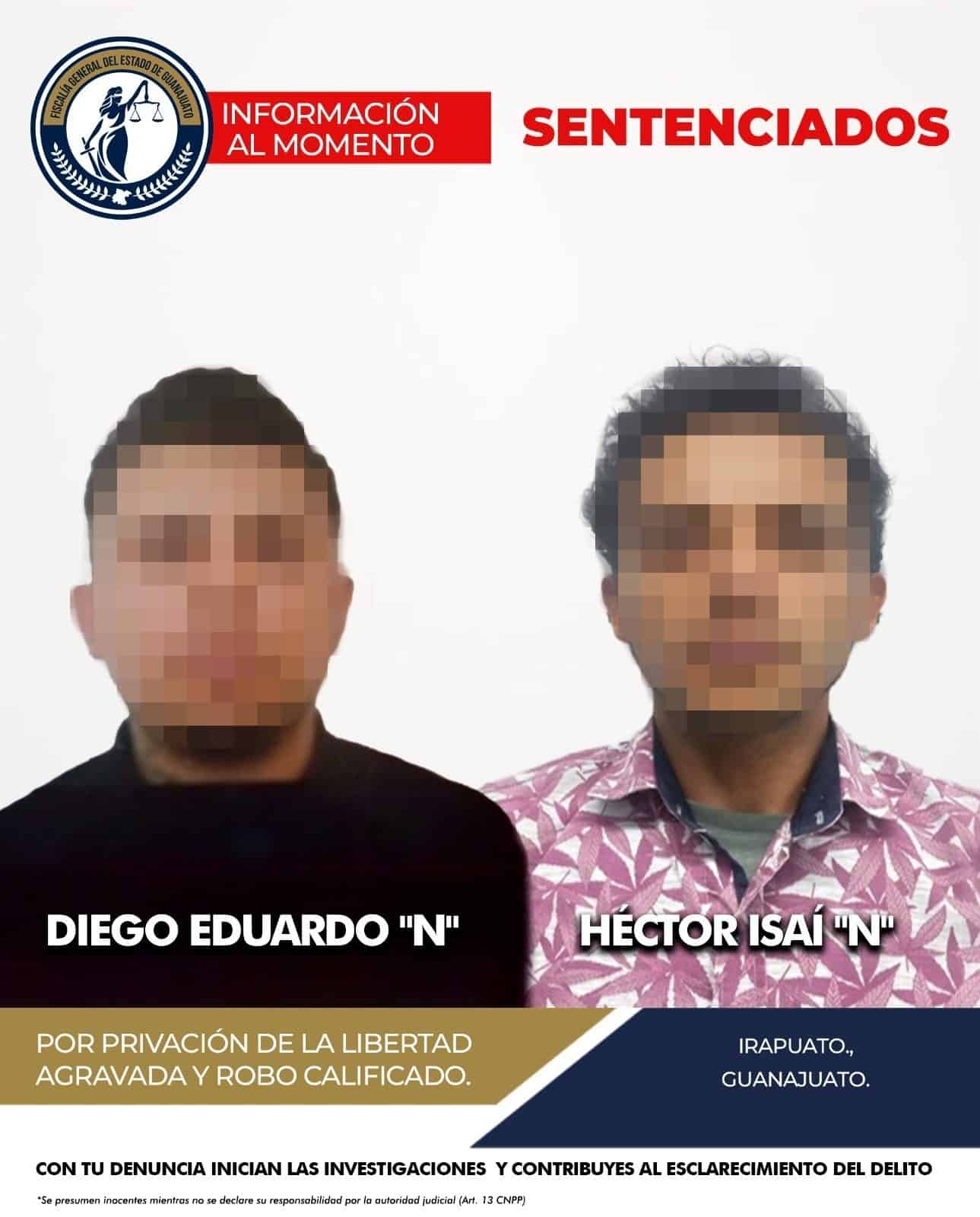 Diego Eduardo “N” y Héctor Isai “N”, fueron sentenciados luego de que fuera acreditada su responsabilidad penal en los delitos de robo y privación de la libertad agravada, cometidos en contra una persona en la ciudad de Irapuato.
