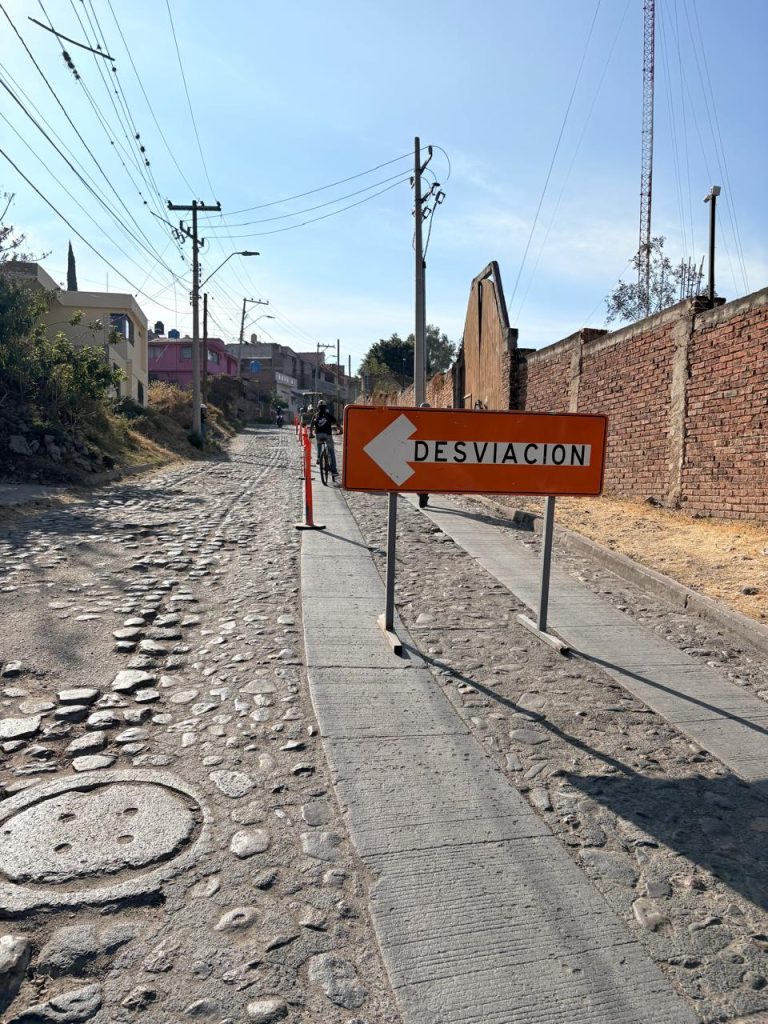 Los trabajos contemplan una intervención integral que incluye la construcción de banquetas, pavimentación con huella de empedrado y nuevo señalamiento vial, con el objetivo de contar con una vialidad más segura tanto para peatones como para automovilistas.