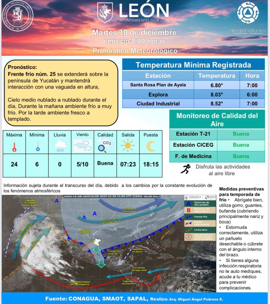 Para este 30 de diciembre, el pronóstico del tiempo en León anticipa mañanas frías y tardes templadas, condiciones típicas de la temporada invernal en la región.