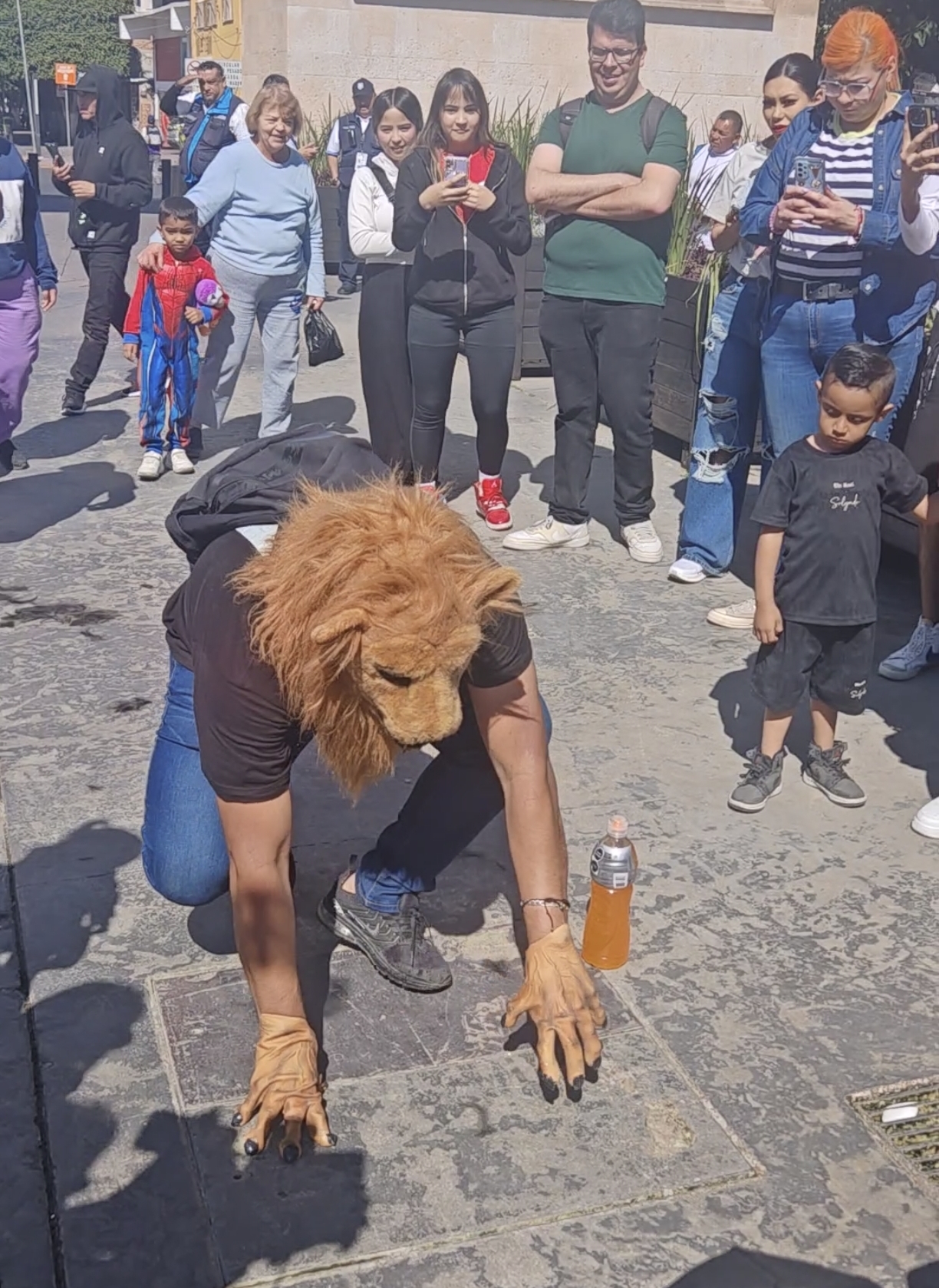 Fue cerca de las 11 de la mañana cuando finalmente un hombre caracterizado como león —con máscara, garras y movimientos felinos— hizo su aparición, desatando la euforia entre los presentes, quienes rápidamente comenzaron a seguirlo, grabarlo y tomar fotografías.