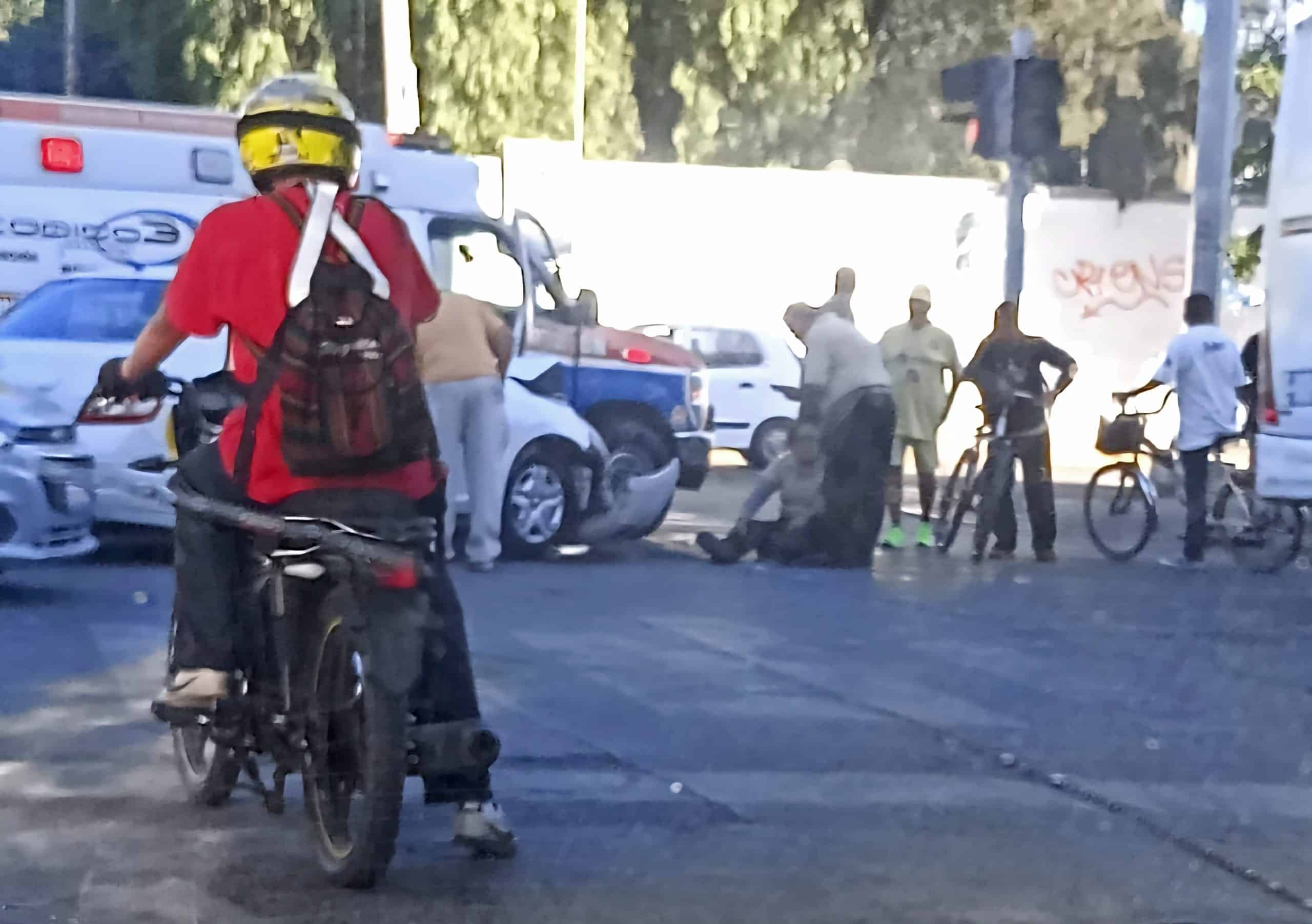 1. Persona en bicicleta en medio del tráfico, accidente vial en ciudad mexicana.