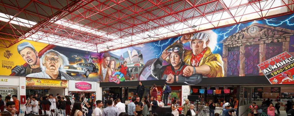 En el mercado de la Plaza Hidalgo fue develado el mural “Volver al futuro” diseñado por artistas leoneses del Instituto Municipal de la Juventud.