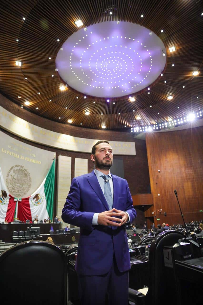 1. Hombre en sala de sesiones del Congreso de México con techo de madera y luces 100% relevant.