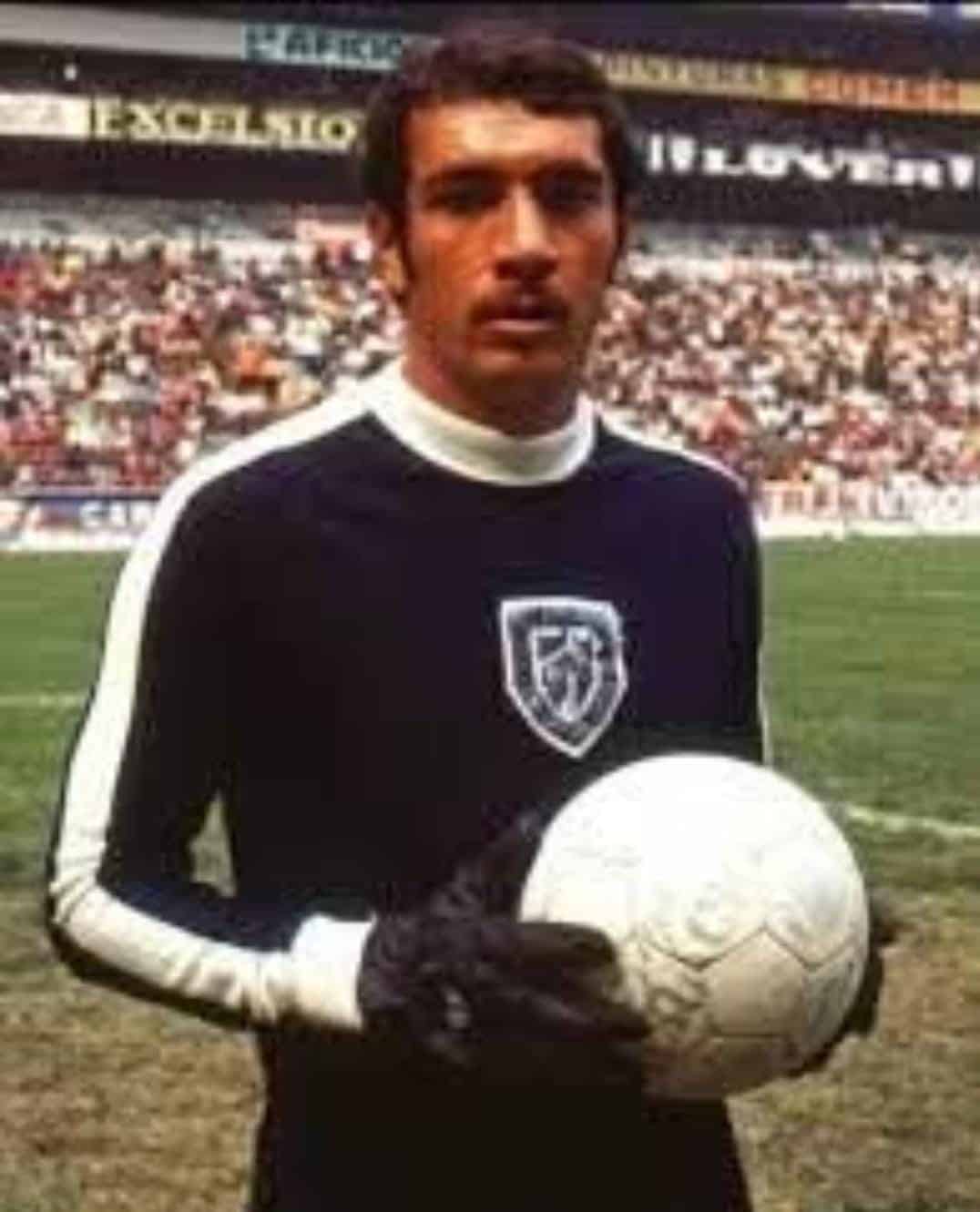 Golero de fútbol histórico, portando balón en estadio lleno de espectadores. Icono del deporte mexicano, uniforme negro con escudo.