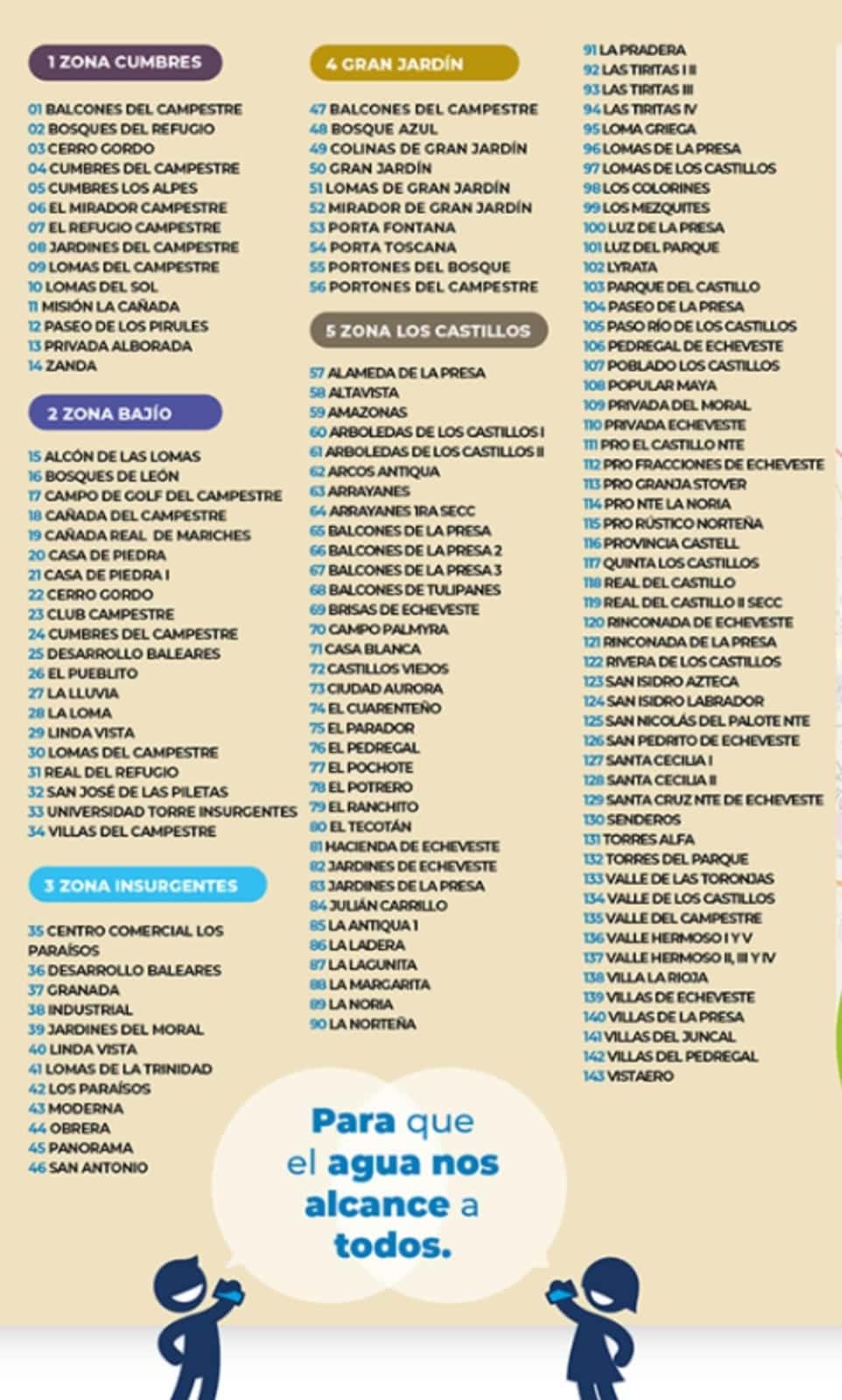 Las 143 colonias, representan el 6.9 por ciento del total de colonias donde SAPAL entrega agua en León, es decir el 93.1 de la ciudad, mantendrá su servicio de manera regular.