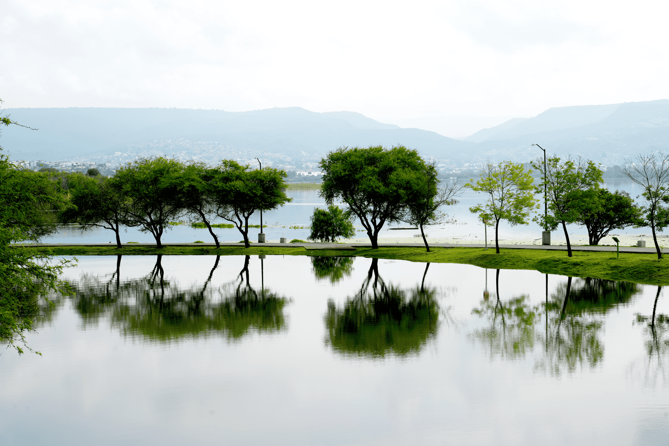 Paisaje natural con árboles y lago, ideal para relajarse y conectar con la naturaleza.