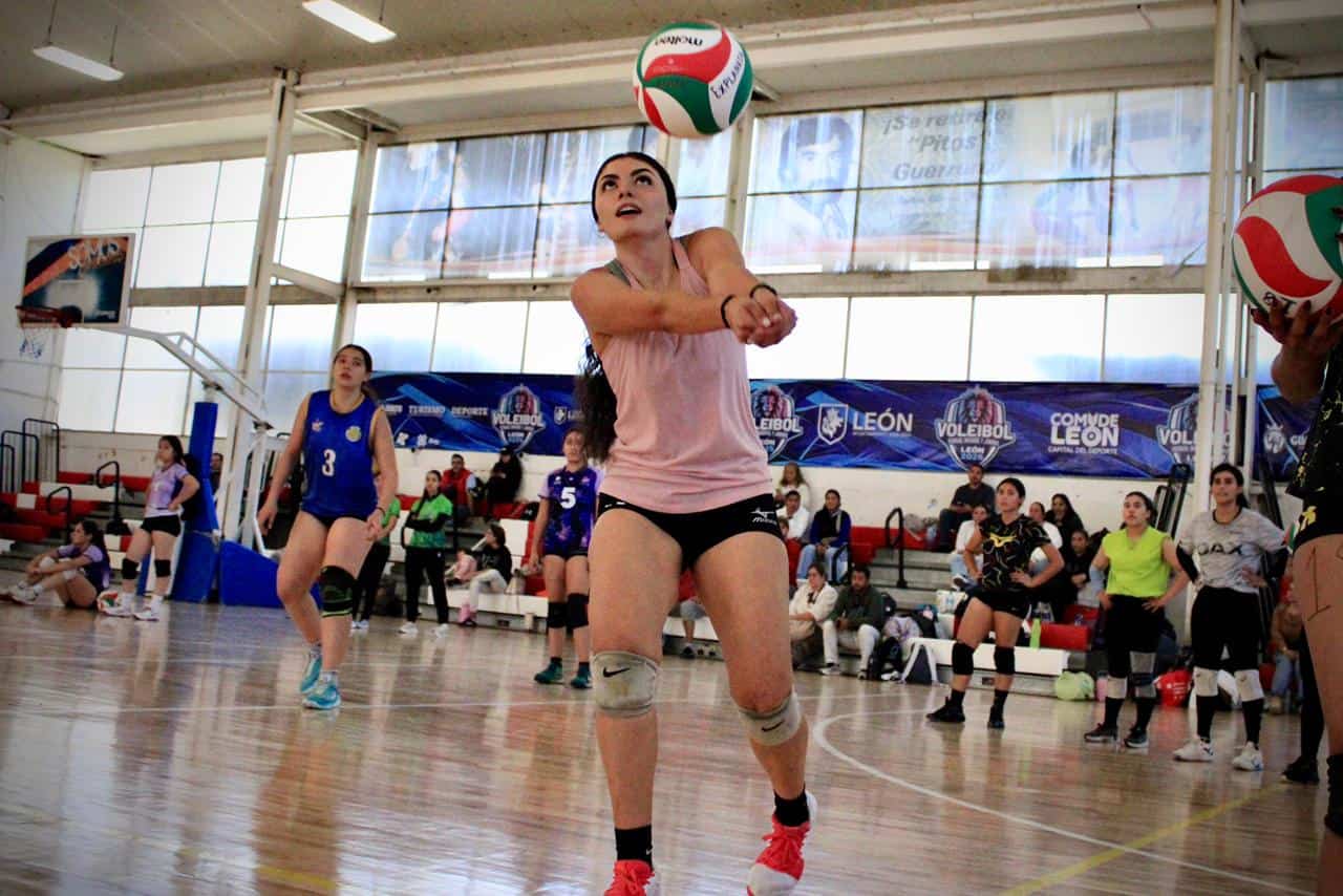 Jugadora de voleibol en acción en gimnasio de León, demostrando habilidades y trabajo en equipo.