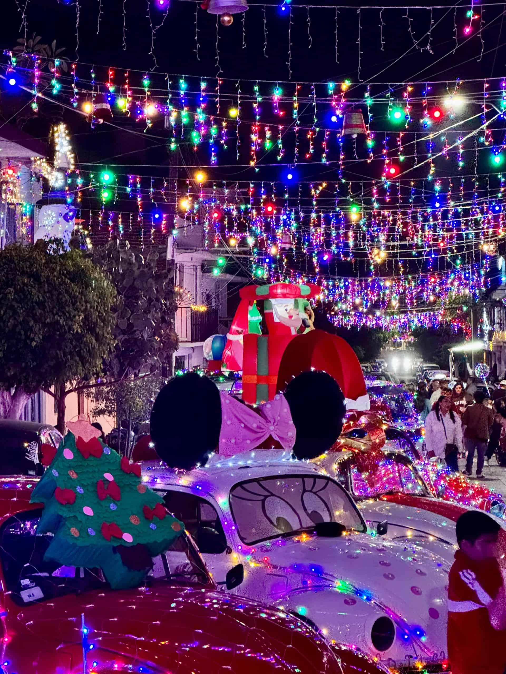 Decoración navideña en la calle con autos adornados y luces multicolores, creando un ambiente festivo y alegre para Navidad.