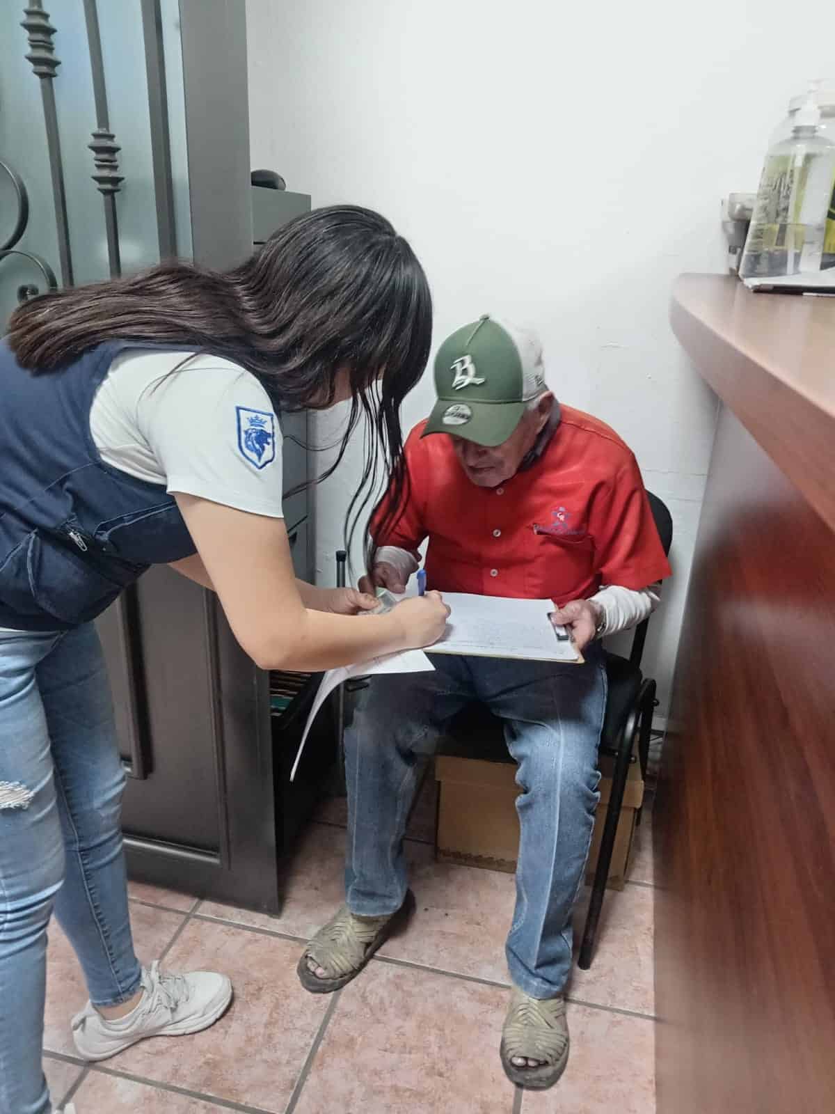 Adulto mayor recibiendo ayuda en oficina con asesoramiento en trámites y servicios de apoyo.