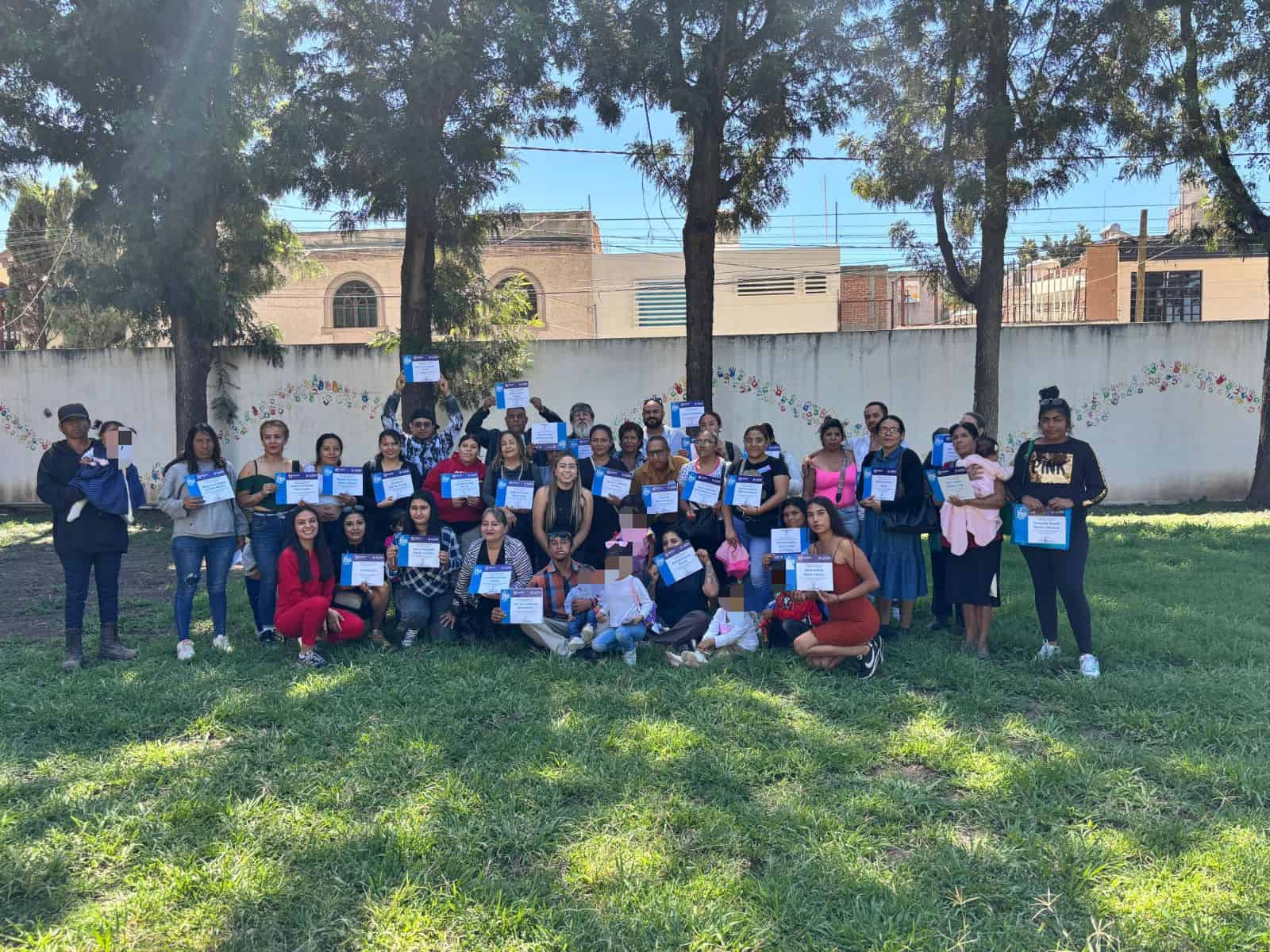 Grupo de personas en un evento al aire libre, celebrando con certificados y sonrisas, en un ambiente comunitario y festivo.