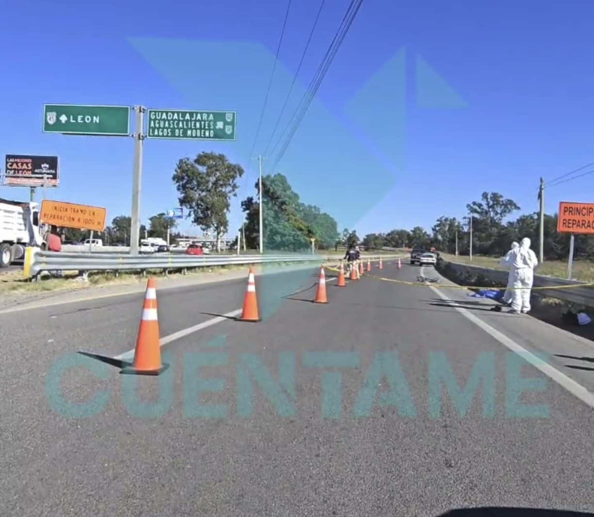 Obras en carretera en Guadalajara, México, con señalización y personal de reparación en el sitio.