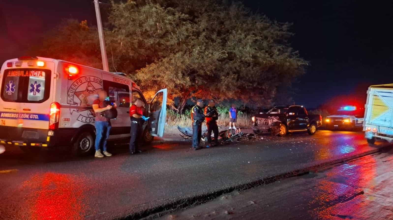 Accidente vial en León Gto, bomberos y paramédicos atendiendo una colisión en carretera.