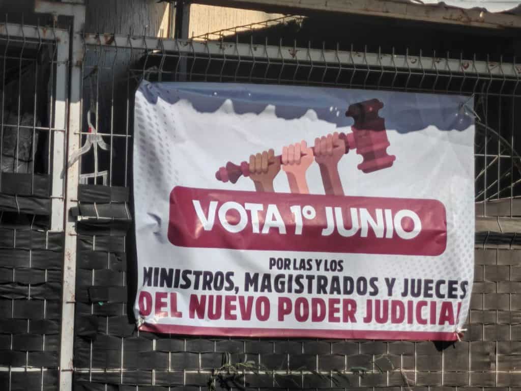 Las mantas, colocadas en distintos puntos de la ciudad, incluyen la frase “Vota 1 de junio por las y los ministros, magistrados y jueces” y están diseñadas con los característicos colores guinda y blanco del partido Morena, lo que ha levantado críticas por la presunta politización del proceso.