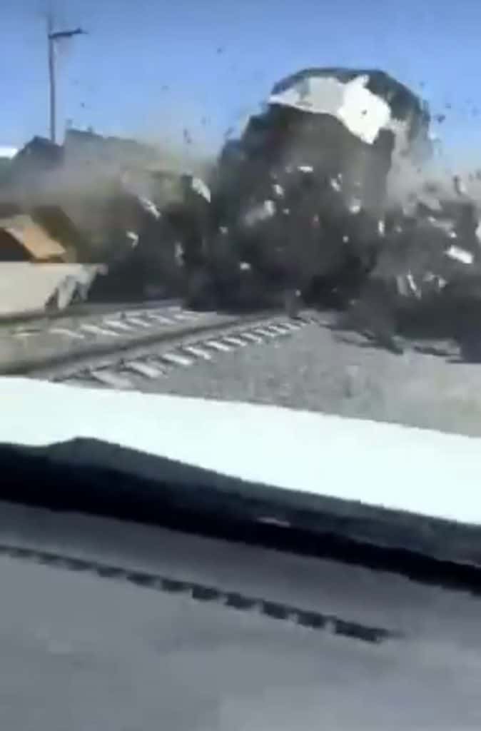 Automovilistas que esperaban a que pasara el tren captaron en video el impresionante momento en que “la bestia” embiste al tráiler y lo parte en dos, esparciendo la carga por el área y golpeando a varios vehículos que se encontraban cerca del sitio.