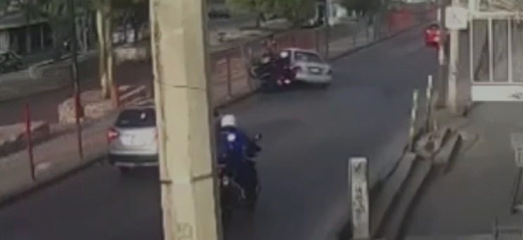 Se aprecia como ambas unidades circulaban a exceso de velocidad, y cuando el policía se aproxima al vehículo este lo impacta derribándolo junto con la malla del camellón central.