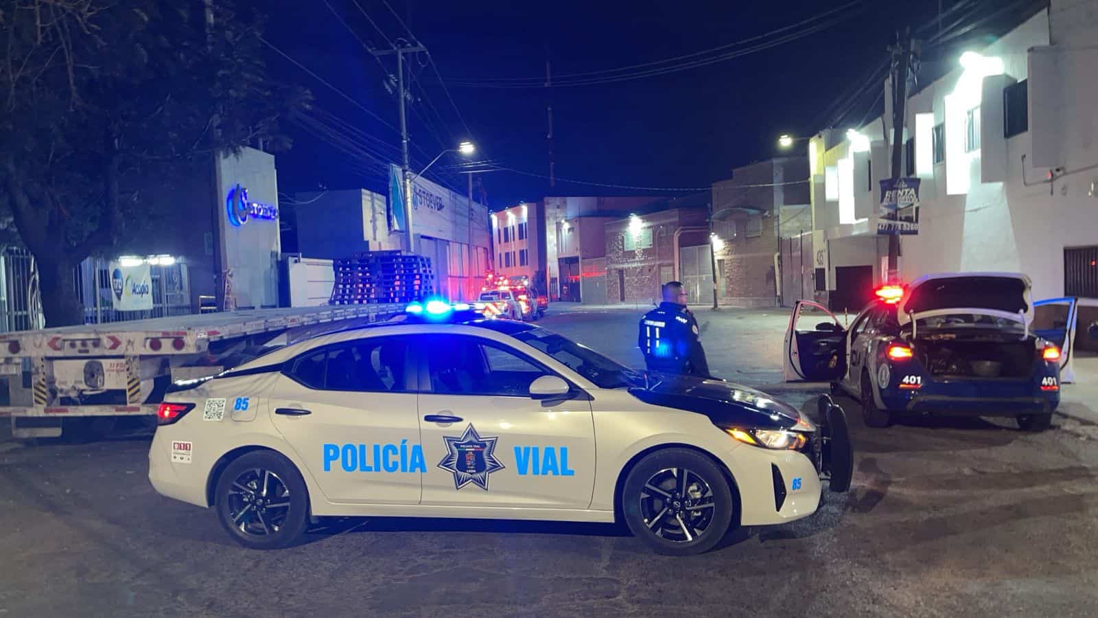 Policía vial en escena de accidente durante la noche en una calle de la ciudad.