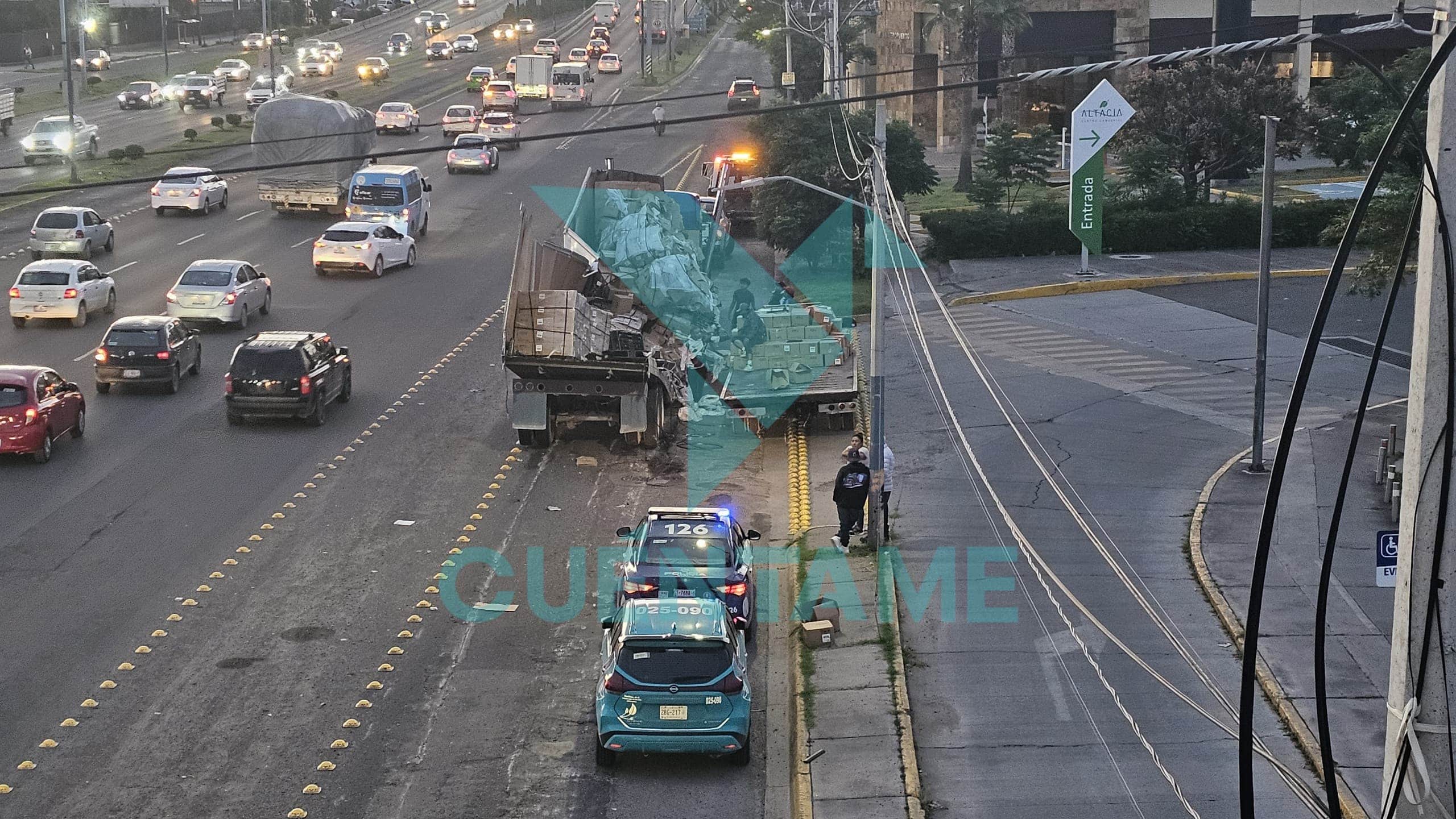 De acuerdo con los primeros reportes, al tomar la curva, la carga mal asegurada venció el equilibrio del tráiler, provocando que la unidad volcara.