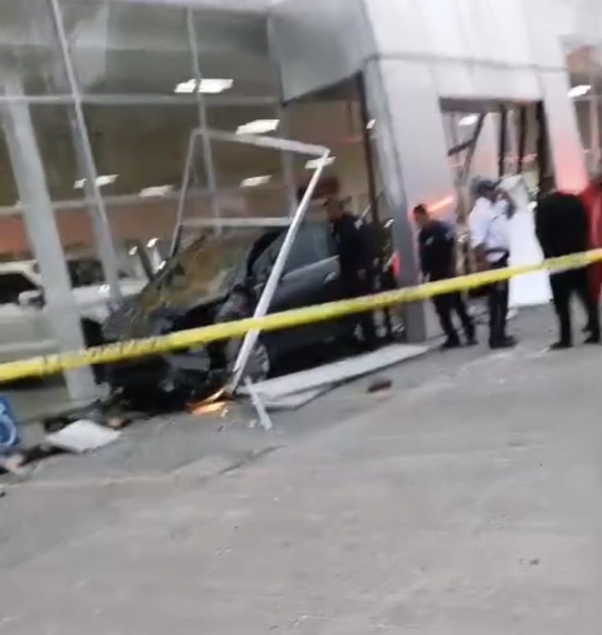 La camioneta terminó impactada contra la fachada de una agencia de autos, donde el conductor permanecía aturdido tras el choque. De acuerdo con los reportes preliminares, fue detenido por las autoridades locales bajo la sospecha de conducir en estado etílico.