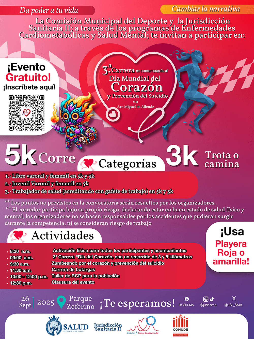 La Secretaría de Salud exhorta a todos los participantes a acudir portando playera de color rojo o amarillo, símbolo de la salud cardiovascular y salud mental.