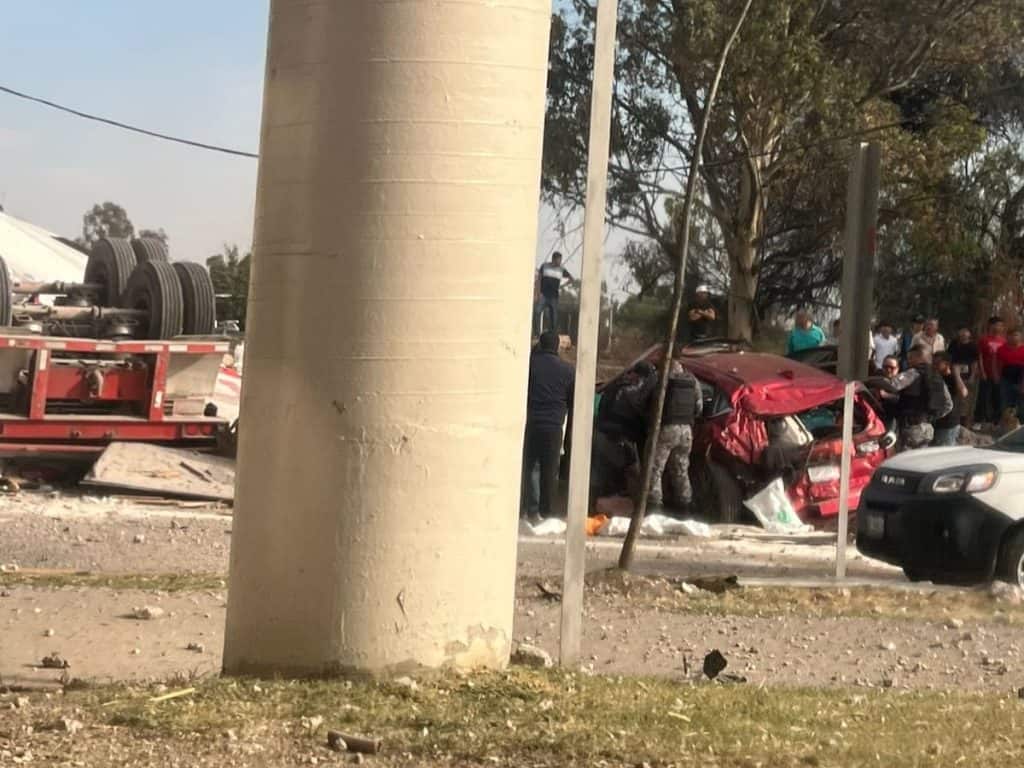 La tarde de este lunes se registró un fuerte accidente sobre la carretera León–Aguascalientes, luego de que la carga de un tráiler cayera desde un puente y terminara impactando una camioneta particular, lo que dejó como saldo varias personas lesionadas, de manera preliminar.