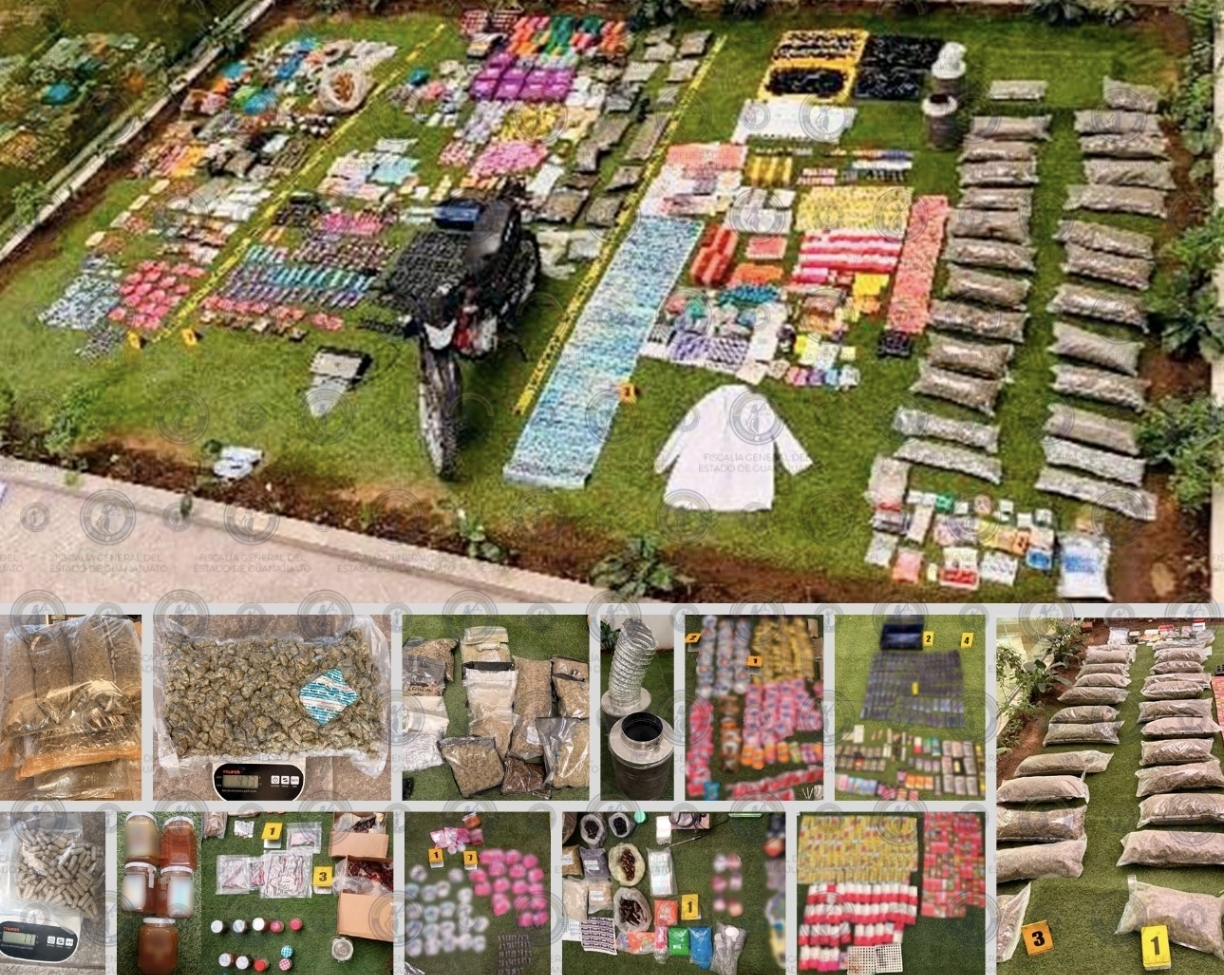 También fueron aseguradas bolsas con hierba seca y pulverizada, así como diversas sustancias en presentación sólida y granulada en colores blanco, café, rosa y amarillo, distribuidas en envoltorios y frascos. De acuerdo con las autoridades, el peso total de estas sustancias supera varios kilogramos.