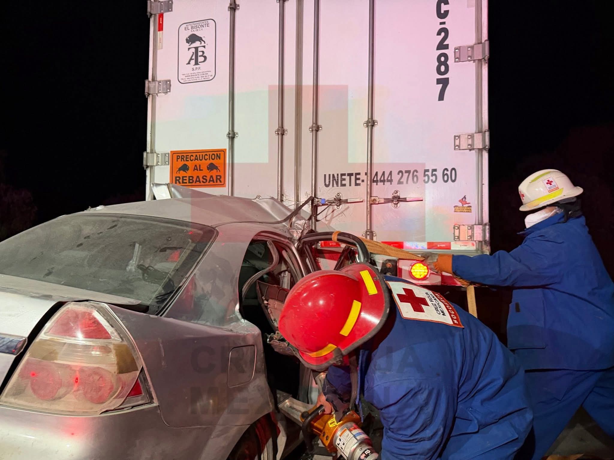 De acuerdo con los primeros reportes, el conductor de un automóvil tipo sedán impactó por la parte trasera a una unidad de carga, presuntamente debido al exceso de velocidad. La fuerza del choque fue tal que los tripulantes del vehículo compacto quedaron prensados entre los fierros retorcidos.