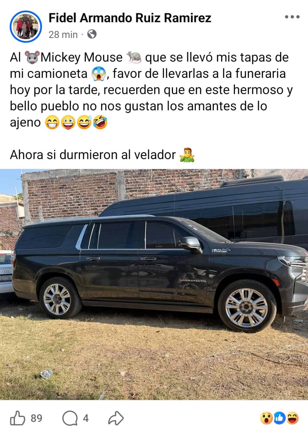 De acuerdo con el propio edil, el hecho ocurrió recientemente y consistió en el robo de las “tapas” o molduras del vehículo. En su mensaje, utilizó un tono irónico para referirse a los responsables, a quienes llamó “Mickey Mouse”, y les pidió devolver las piezas, incluso sugiriendo que las llevaran a una funeraria.