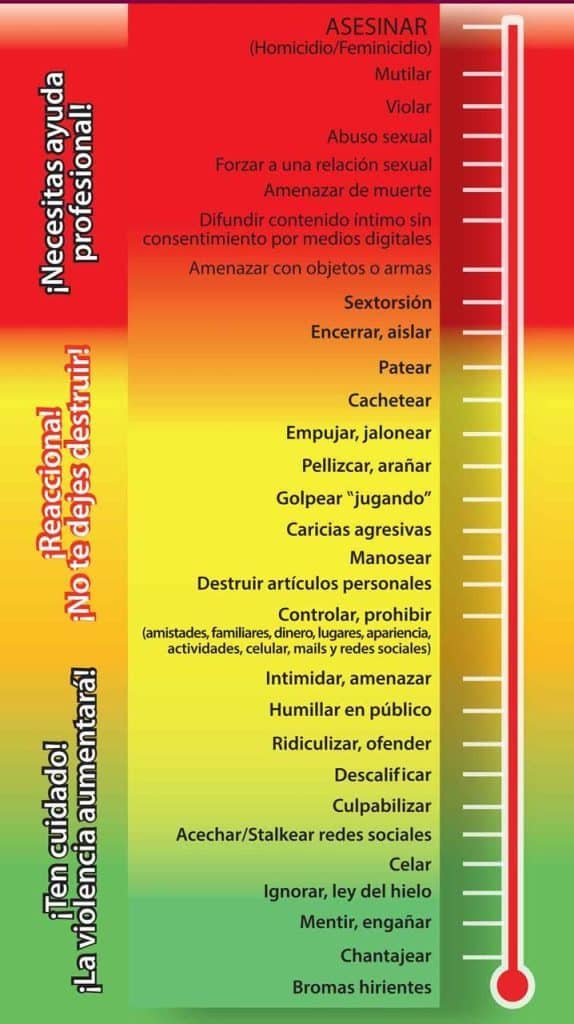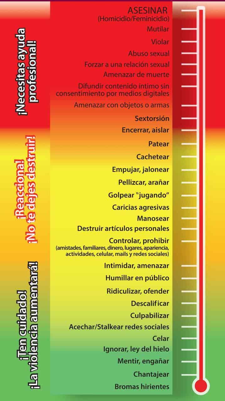 El violentómetro se divide en tres segmentos de colores que representan distintas formas de violencia: