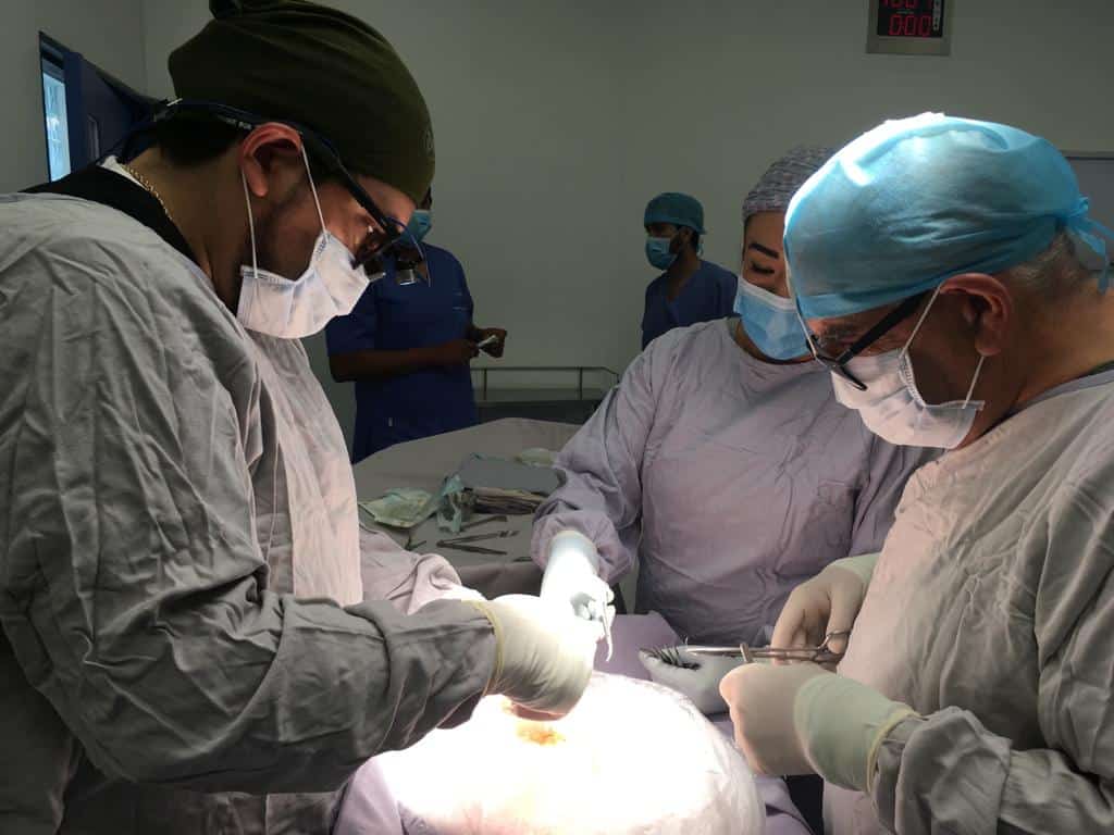 Equipo médico realizando cirugía en un entorno clínico especializado.