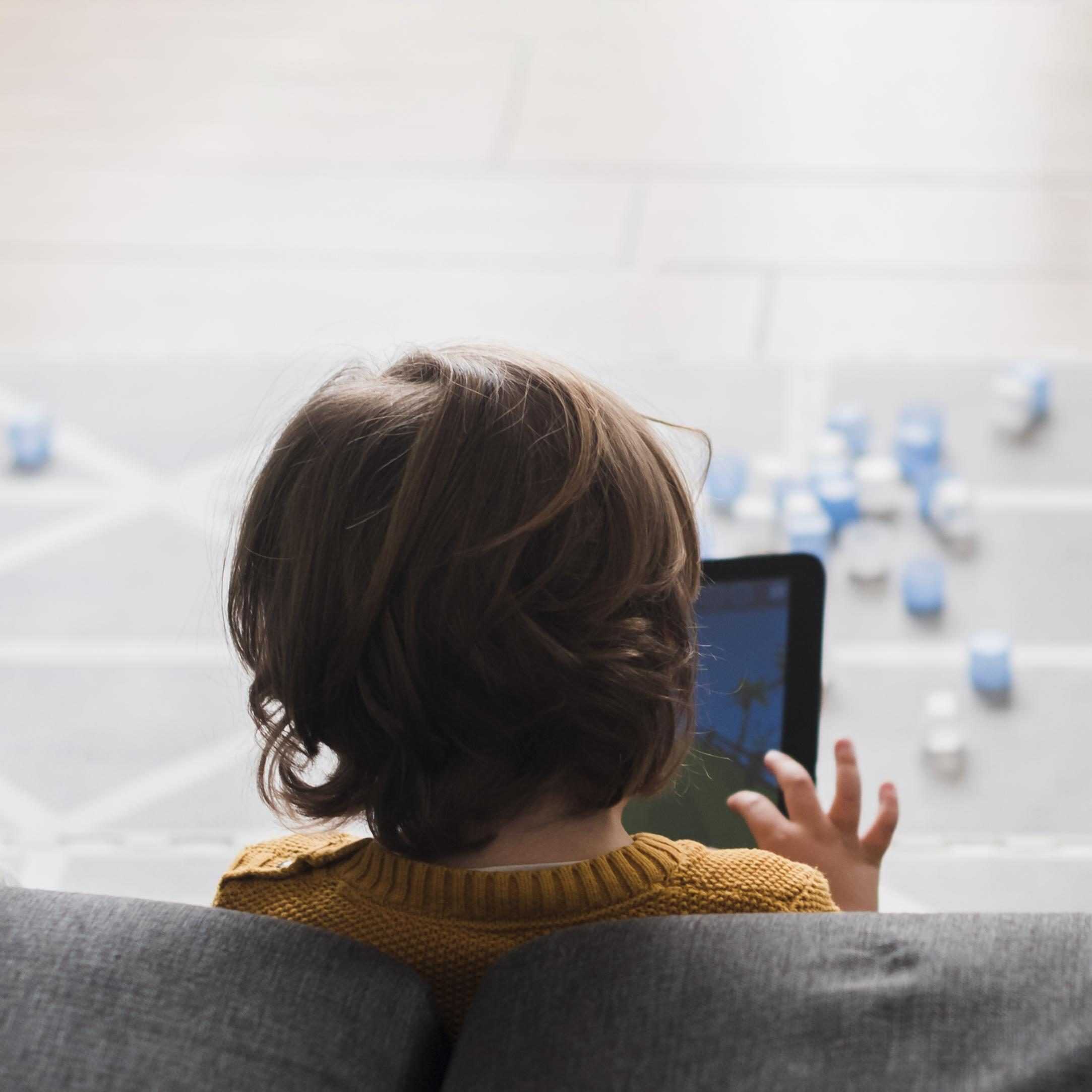 Niña viendo una tablet en un sillón, pensativa y concentrada en el contenido.